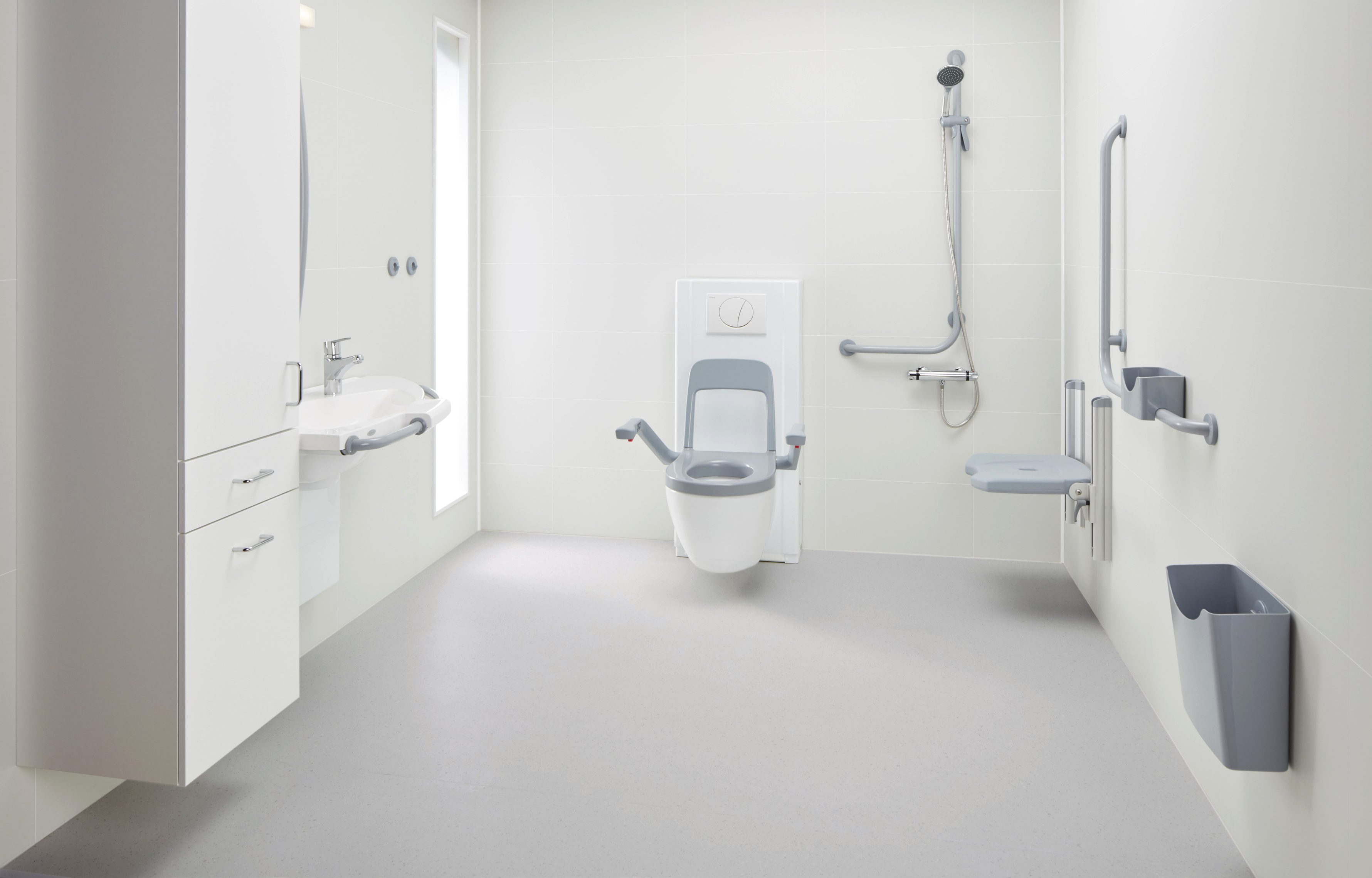 Stödhandtagen ger ett tvåplatshandtag när man står vid tvättstället – vertikalt handtag på skåpet, horisontellt handtag på tvättstället.